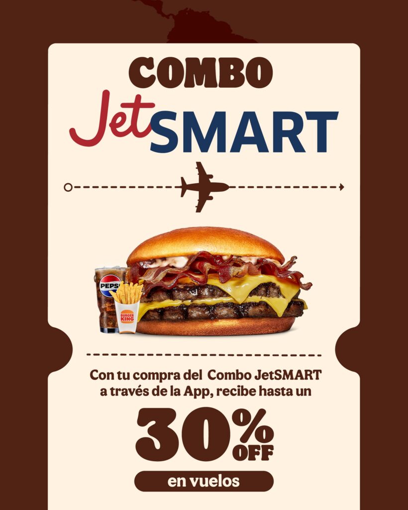 Burger King y JetSMART anunciaron una colaboración que combina dos pasiones de los chilenos: el disfrute gastronómico y la posibilidad de viajar. La iniciativa estará disponible de manera exclusiva a través de la aplicación MI BK, donde los usuarios podrán adquirir el “Combo JetSMART”.