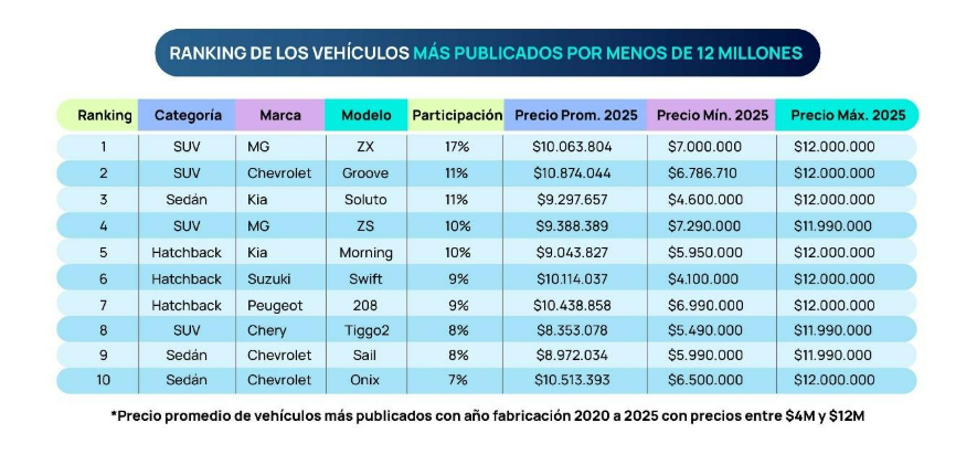 Sin duda, este ranking funciona como una guía real del mercado para quienes buscan su próximo auto con un presupuesto bajo los $12 millones, pero también para los que necesitan publicar y/o vender su vehículo. Esto les permite identificar cómo se está comportando el mercado, qué modelos compiten en cada tramo de precios, cuáles segmentos son los que tienen más movimiento y cómo ajustar expectativas sobre la venta.