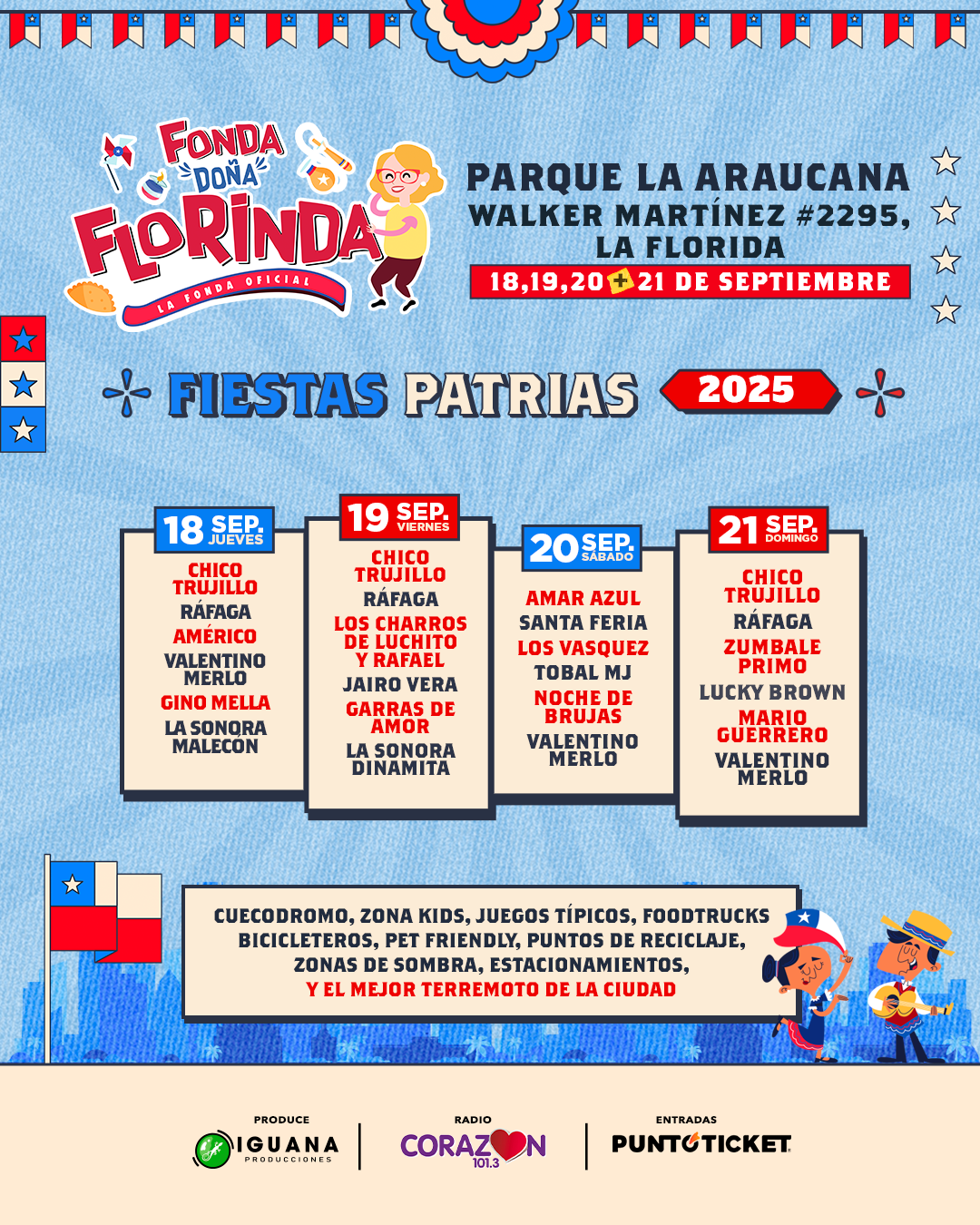 Iguana Producciones se enorgullece de invitar a toda la comunidad a vivir las Fiestas Patrias en la Fonda Doña Florinda en La Florida con actividades y música para todos los gustos.